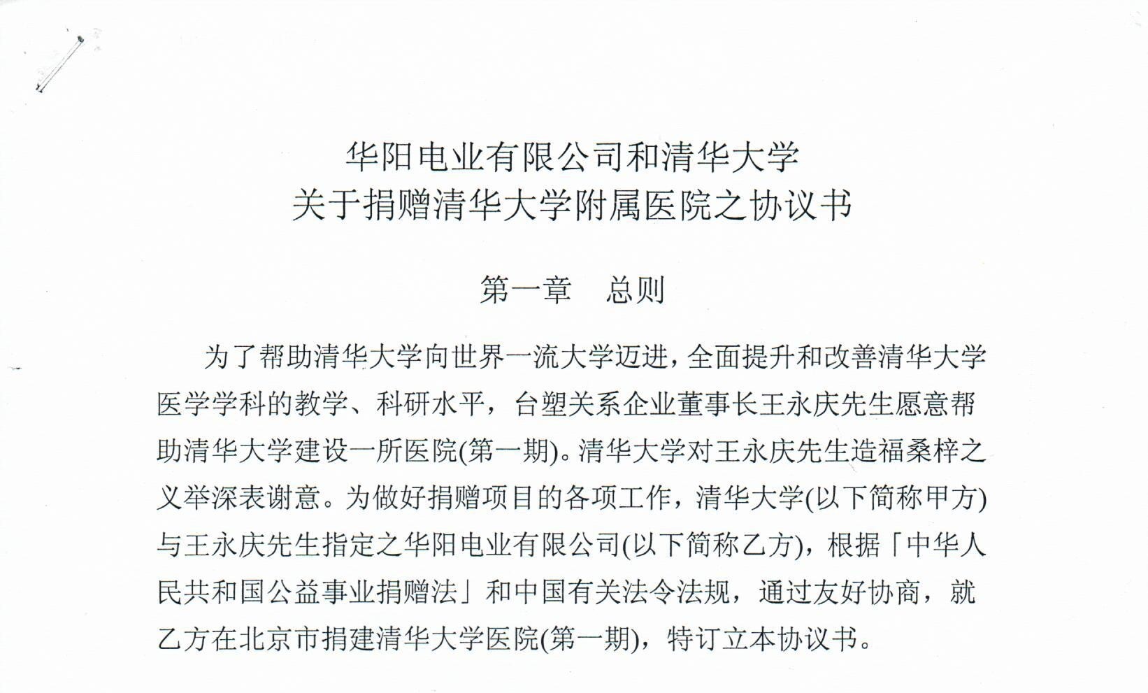 2004年7月,清华大学与台湾华阳电业有限公司(台塑关系企业)正式签定捐赠清华大学附属医院协议书。