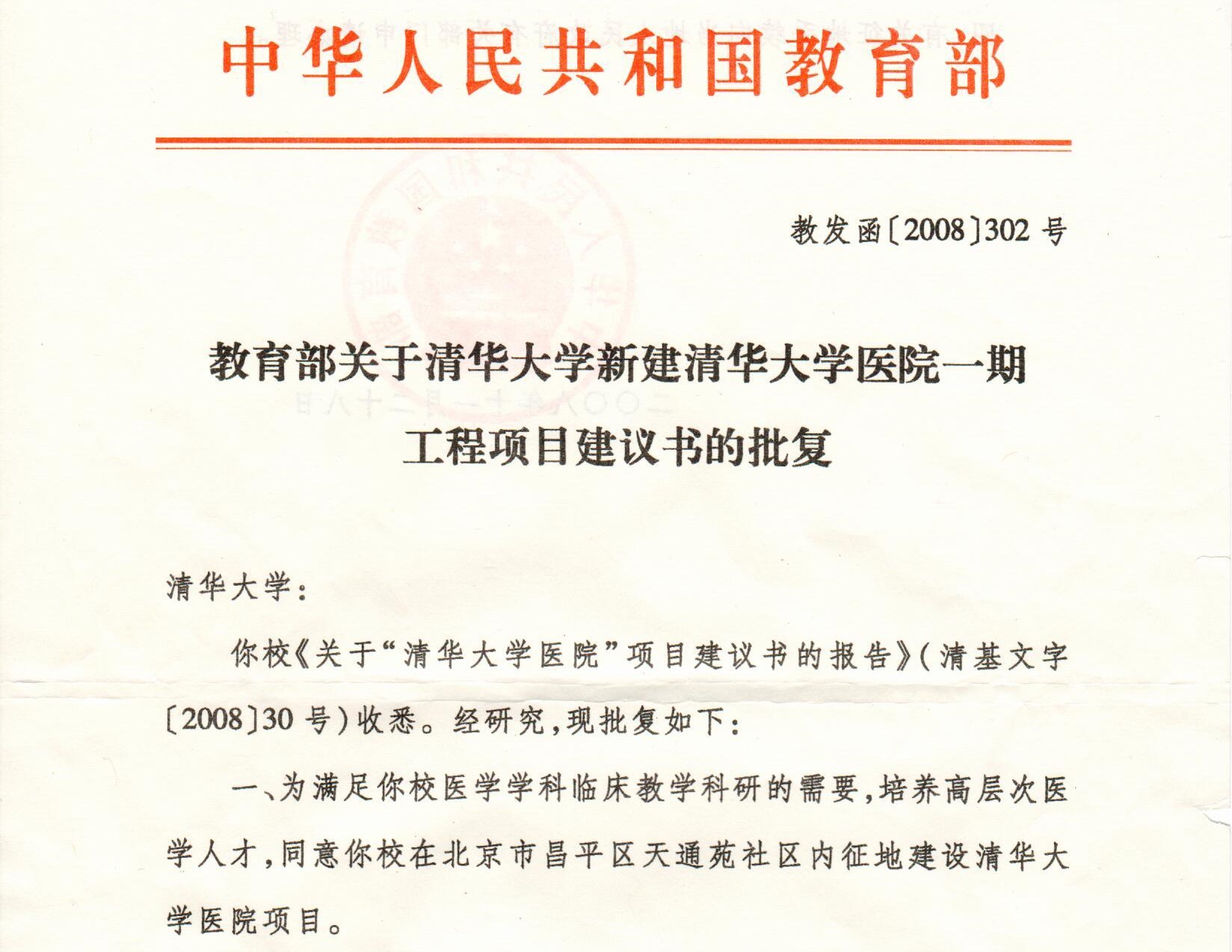 2008年11月,教育部批复“关于清华大学新建清华大学医院一期工程项目建议书”(教发函〔2008〕302 号);北京市人民政府召开“关于研究推进清华大学在天通苑地区建设非营利性医院有关问题的会议”,同意清华大学在天通苑地区建设总规模为1500 张床位,一期1000 张床位的非营利性综合医院。