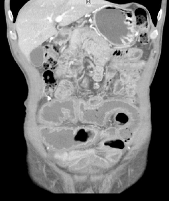 术前腹部CT可见盆腔部位肠管肠壁水肿、纤维化,近端肠管扩张。