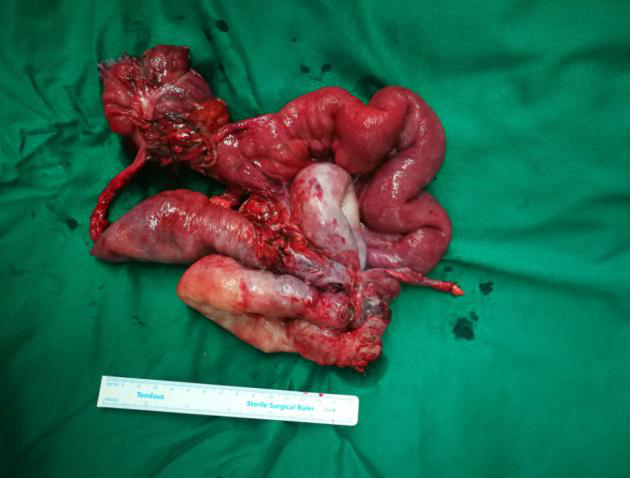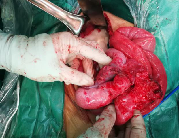 入院2周后行确定性手术,术中可见距离回盲部30cm至60cm小肠与盆底骶前形成致密性粘连,肠腔节段性狭窄,呈明显放射性损伤改变,盆腔处小肠受放射损伤较重,并且有局部冰冻盆腔改变,未见肿瘤复发及转移结节,一并切除远端约100cm病变小肠和回盲部,近端保留约400cm小肠。