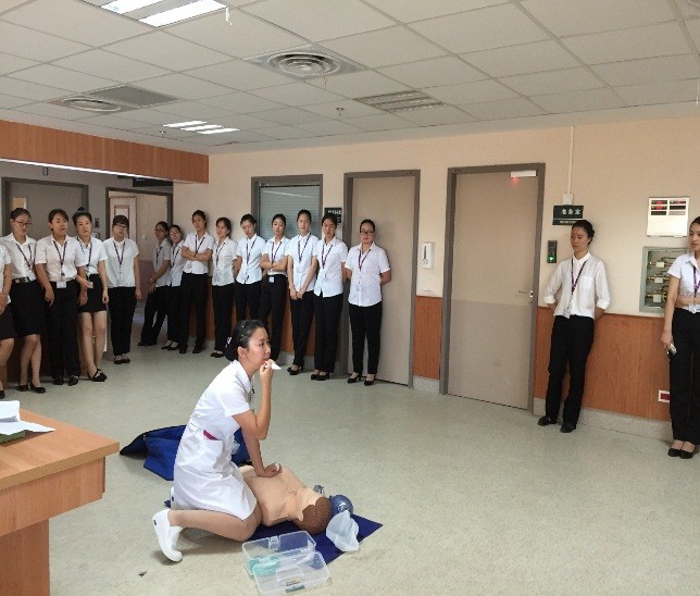 八大系统授课内容包括呼吸、消化、泌尿、神经、内分泌、运动、循环系统的解剖及常见疾病护理。操作部分分为课堂培训及实践培训,包括病患辨识及医嘱处理、无菌技术、生命体征测量、穿脱隔离衣、静脉输液、静脉采血、心肺复苏、吸氧、吸痰、备血、输血、注射法、导尿等共13项常用护理技术。讲师们用现场互动的方式,寓教于乐,联系临床实际案例进行知识的讲授,使新进人员更易理解并结合于实践。