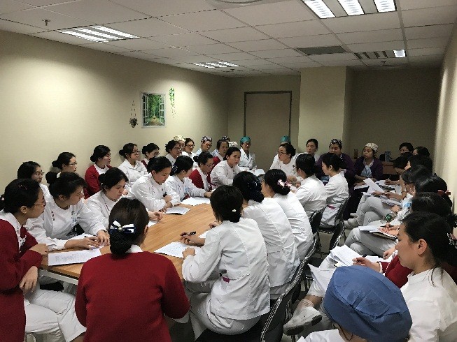 查房当天,该病人的责任护士首先在讨论室根据病人情况运用护理程序进行病例报告,包括病人基本情况、疾病诊疗过程、护理问题、护理计划、已采取的主要护理措施及效果等;随后,到病人床旁结合专科特性对病人进行护理查体、评估,并与病人进行沟通,以确定病人当前存在的主要护理问题;最后回到讨论室进行问题讨论。5A病房所有参加查房的护理人员都积极参与讨论,各抒己见,再由护士长对整个查房内容进行评价及总结,部分其他科室护士长及护理部各位督导也对查房过程中存在的问题进行了补充指导和点评,并根据护理查房评分表从责任护士的仪表举止、查房准备、病例报告、护理查体、有效沟通,到主查人组织的问题讨论、总结指导等几个方面对整个护理查房进行评分反馈。