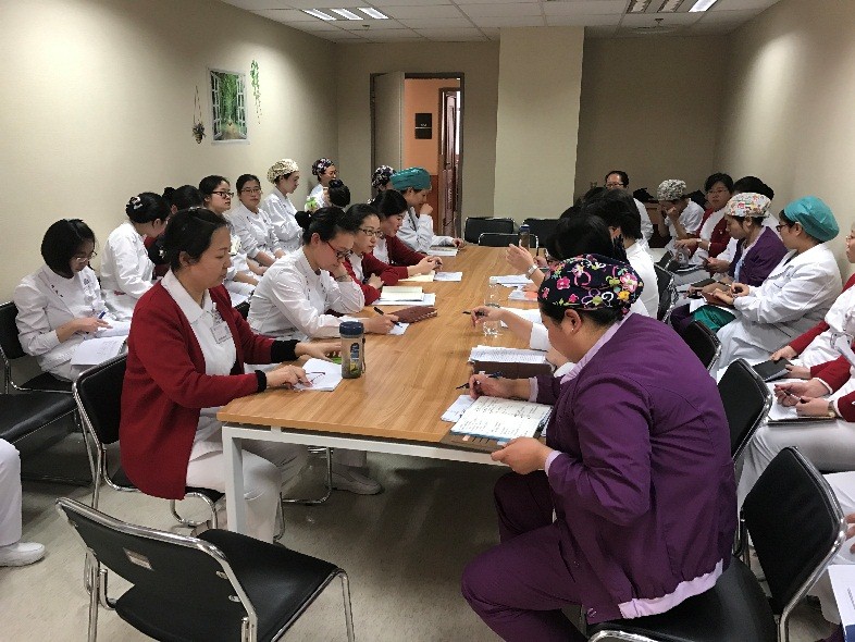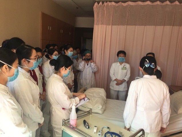 经过前期的培训及试查房,2017.2.23下午在5A病房进行了第一次护理教学查房,5A病房护士长为主查人。由于是首次教学查房,这次查房也有着示范及教学观摩的目的,故5A病房部分护理人员、护理部副主任及各位督导、全体护士长近50人参加了此次查房。本次护理查房选取了呼吸内科比较常见的COPD病人作为案例。在查房前两天,护士长提前与病人进行了沟通,取得病人的同意和配合,并通知全病房护理人员。