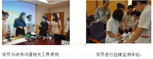 为期4天培训主要以讲授结合实践体验的形式进行,授课内容主要围绕“认识糖尿病、饮食篇、运动篇、监测篇、药物治疗篇、护足篇、心理调适篇、低血糖的识别与预防、糖尿病急性并发症的识别与治疗、慢性糖尿病的识别与治疗、糖尿病的常见生活误区、糖尿病患者生活常识”等12套糖尿病教育标准化幻灯片进行讲解,特别邀请到了国内糖尿病健康教育管理领域的专家,包括:中日友好医院护理部赵芳副主任、北大人民医院内分泌科张明霞护士长、北医三院内分泌科王群护士长、运动医学科玉应香医师、解放军306医院王爱红副主任,以及我院内分泌科肖建中主任、营养科杨勤兵主任、护理部沈犁副主任等老师。他们大多参与了12套幻灯片的编写与审核,授课方式生动、课堂气氛活跃,结合生动的案例、恰当的教具及实践体验,让每位学员亲身感受如何进行糖尿病健康教育。培训的课堂上,学员们认真仔细地听每位讲师讲课,积极参与互动,开展小组式讨论,学习氛围浓厚。在课间休息时,热情依然不减,和讲师们一起探讨自己在健康教育中的困惑与不解,在培训中更新了糖尿病的健康教育理念。