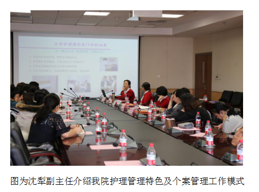 为了让解放军总医院第二医学中心老师们更全面的了解我院的建设与发展状况,在播放完我院建设总历程的宣传片后,沈犁副主任又用PPT图文并茂的介绍了我院整体管理架构、护理管理模式,尤其重点介绍了我院全责护理特色、个案管理师规范化培训与岗位设置、个案管理标准化流程及个案管理信息化建设等内容。解放军总医院第二医学中心护理部王晓媛主任表示:作为一家传统医院的护理人员能够到清华长庚这个充满新鲜血液的新型医院学习交流是很必要也非常有意义的,我们医院的文化理念、护理管理模式及个案管理工作对他们来说都是新颖且值得借鉴的。在听完沈犁副主任的讲解后,更是对我院全责护理模式及信息化管理感触深刻。
