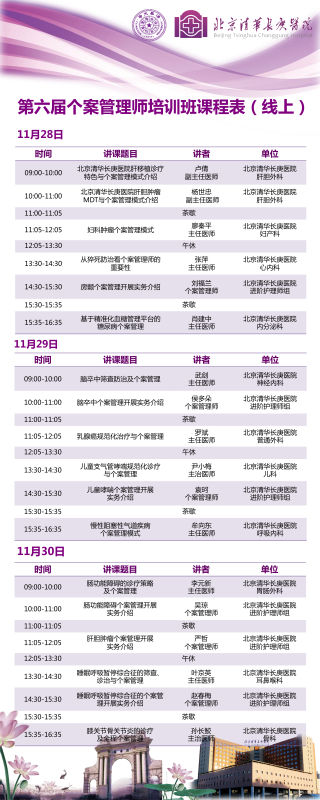 随着“健康中国2030”政策的推进及老龄化趋势对延续护理服务的需求越来越迫切,个案管理模式将被推广到更多的专科领域,覆盖到更多的地区。为促进个案管理模式在疾病管理领域的发展,推广个案管理理念及临床实践,培养更多个案管理人才,北京清华长庚医院护理部将于2020年11月21日–11月30日举办第六届“个案管理师培训学习班”,邀请台湾知名专家、个案管理师团队及大陆医学和护理专家进行专题讲座及实例指导与交流。本次培训班包含理论培训和临床实践培训两部分。其中,理论培训课程为:11月21日–11月22日2天线下核心课程及11月28日–11月30日3天直播课程;临床实践培训课程为:11月23日-11月27日为期5天。学员完成理论培训(线上、线下)且考核合格后授予《个案管理师理论培训结业证书》;完成临床实践培训且考核合格后授予《个案管理师临床实践结业证书》。欢迎广大同仁学习交流,共同探讨个案管理的实践与发展。