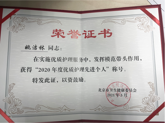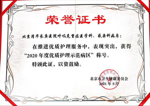 北京清华长庚医院5月12日电(通讯员 韩杰)2021年5月12日为第110个国际护士节。为加大护理先进典型宣传力度,弘扬伟大抗疫精神,进一步增强护士职业荣誉感,北京市卫健委于全市开展 2020 年度优质护理先进典型推荐工作,并于5月10日举行了护士节表彰大会。北京清华长庚医院12A病房(呼吸与危重症医学科及感染科)荣获“2020年度优质护理示范病区”称号,12A病房副护理长姚洁林获优质护理先进个人称号。