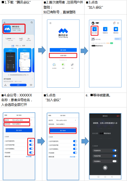 我院在住院病房、隔离病区等19个护士站设置移动设备,每周二、周六13:00-15:00,提供远程探视服务,方便家属详细了解患者住院情况,与患者沟通交流。患者家属在手机或电脑下载“腾讯会议”软件,进入临床科室设置的会议室,通过具体操作流程如下: