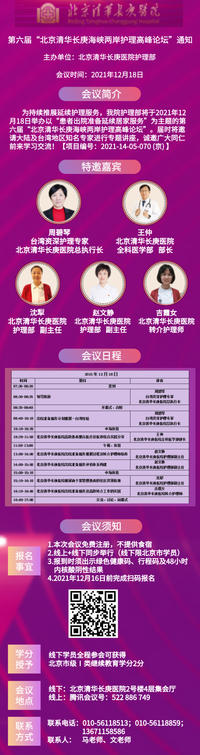 为持续推展延续护理服务创新,我院护理部将于2021年12月18日举办以“患者出院准备延续居家服务”为主题的第六届“北京清华长庚海峡两岸护理高峰论坛”。届时将邀请大陆及台湾地区知名专家进行专题讲座,诚邀广大同仁前来学习交流!【项目编号:2121-04-05-070(京)】