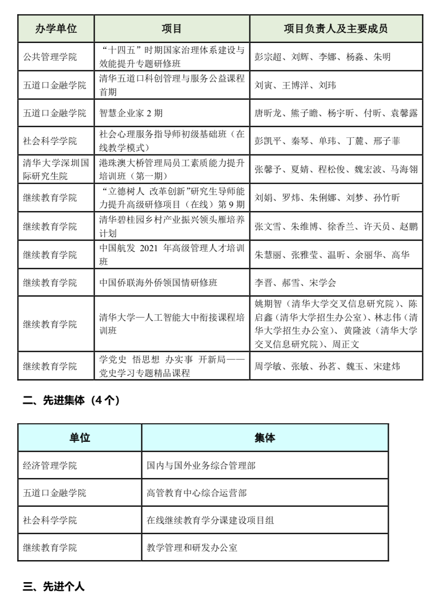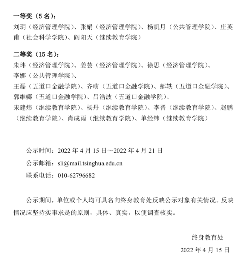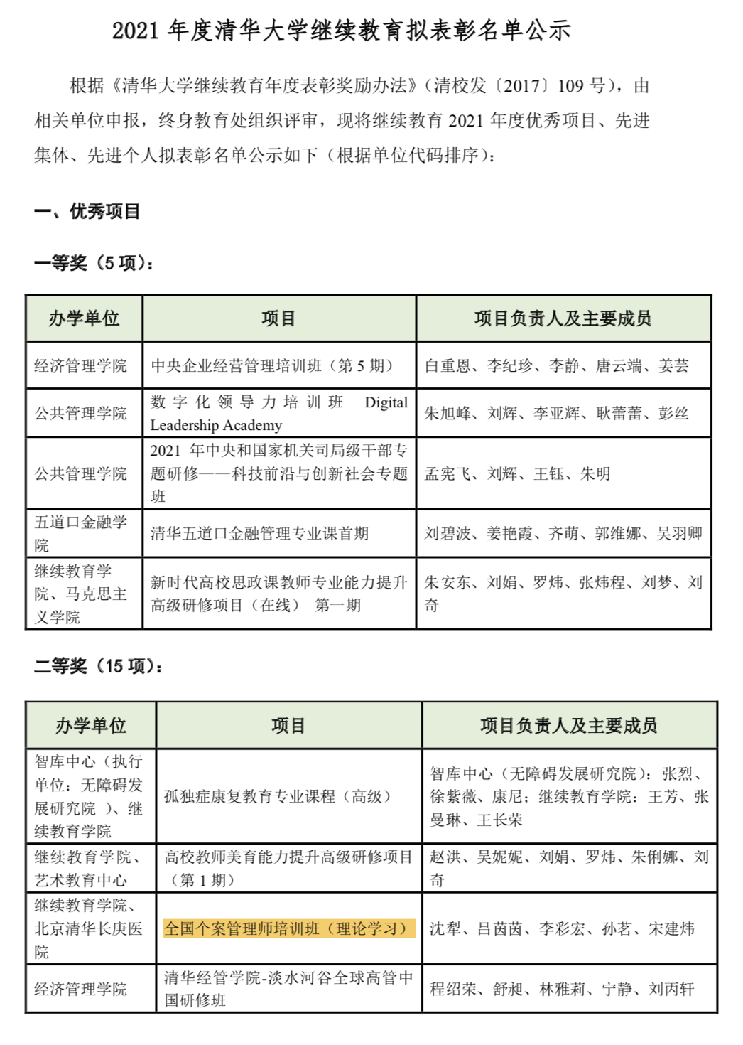 北京清华长庚医院2022年4月29日电(通讯员 李彩宏 吕茵茵)近日,根据《清华大学继续教育年度表彰奖励办法》(清校发〔2017〕109号),由清华大学终身教育处组织评审的2021年度清华大学继续教育拟表彰名单公示,清华大学附属北京清华长庚医院和继续教育学院共同举办的“全国个案管理师培训班”项目荣获2021年度清华大学继续教育优秀项目二等奖。