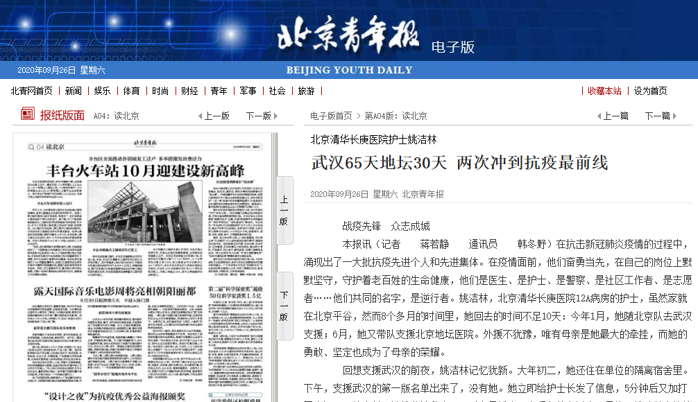 《北京青年报》报道我院抗疫支援护士姚洁林