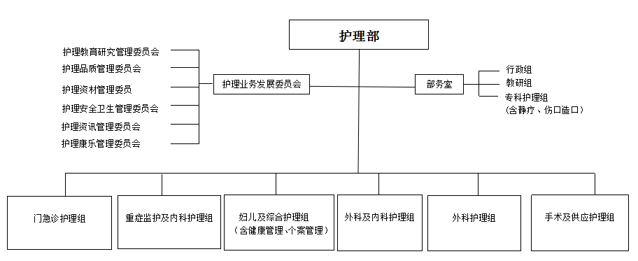 2.护理部管理体系:实行护理部的垂直管理体系;以护理质量控制、护理教学与研究、护理信息化构建、护理资材管控、护理安全与卫生推进,以及护理康乐等六个管理委员会进行综合管理,细化各项管理重点,推进临床各项业务的开展 。