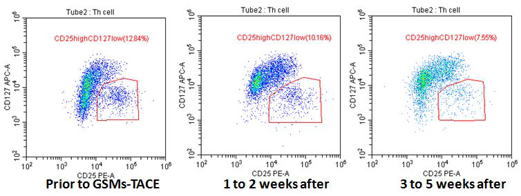 mTACE是近年来治疗中晚期肝癌的主要方法,尤其是对于动脉供血丰富的各种实体恶性肿瘤具有疗效优势。肝胆介入团队于2008年在国内外率先应用可吸收微粒型栓塞剂治疗肝癌,病理学研究与大量的临床实践证实,mTACE可使得术后短期内肿瘤显著坏死,不仅能够快速缓解因肿瘤占位效应导致的肝区不适、疼痛等临床症状,还发现肿瘤在坏死时,激活了自体特异性抗肿瘤免疫反应的临床现象,但该方法对机体免疫功能影响研究尚属空白。调节性T细胞(Treg)是具有免疫抑制功能的T细胞群体。在肿瘤免疫中,Treg细胞通过抑制机体抗肿瘤免疫,进而促进肿瘤的产生与发展。因此,在肿瘤治疗领域中需迫切减少Treg细胞或控制Treg细胞功能来提高机体抗肿瘤免疫应答。