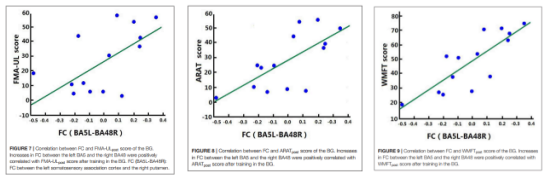 更重要的是,部分增强的FC(如半球内躯体感觉皮层和核壳)与上肢运动功能的提升呈显著的正相关性。左侧顶叶前梨状皮质区(Brodmann area 5,BA5)和左侧额叶下脚后区(BA48)之间FC与训练前、训练后3种上肢运动功能评分均呈正相关。