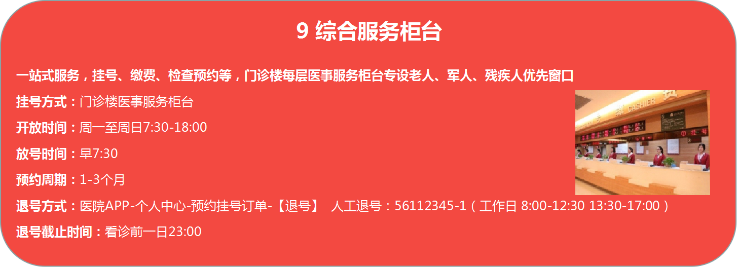 3. 就诊当日,请您参考预约成功后提示的时间先至院区内自助设备或人工柜台【取号】——缴纳医事服务费取得挂号单后,再至相应诊区候诊,请携带本人身份证、医保卡或其他有效身份证件取号就诊,无有效身份证件之婴幼儿童需至人工柜台办理取号。医事服务费已缴患者可直接持电子就诊码/医保卡/电子医保凭证至诊间报到。1号楼一层11号柜台为外币卡缴费快速通道。