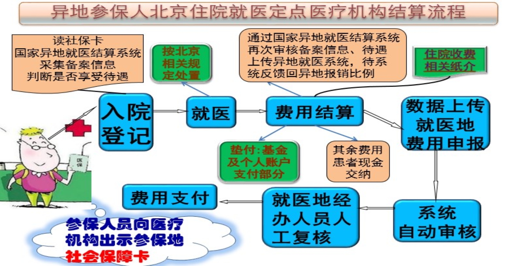 实现异地结算首先需要外地患者在参保地经办机构办理异地就医备案手续。外地医保患者在京直接医保结算住院医疗费用时,按北京市基本医疗保险支付范围,执行北京市药品目录、诊疗项目和医疗服务设施范围及其支付标准;而医保基金起付标准、支付比例、最高支付限额等,按患者所在参保地的相关政策执行。