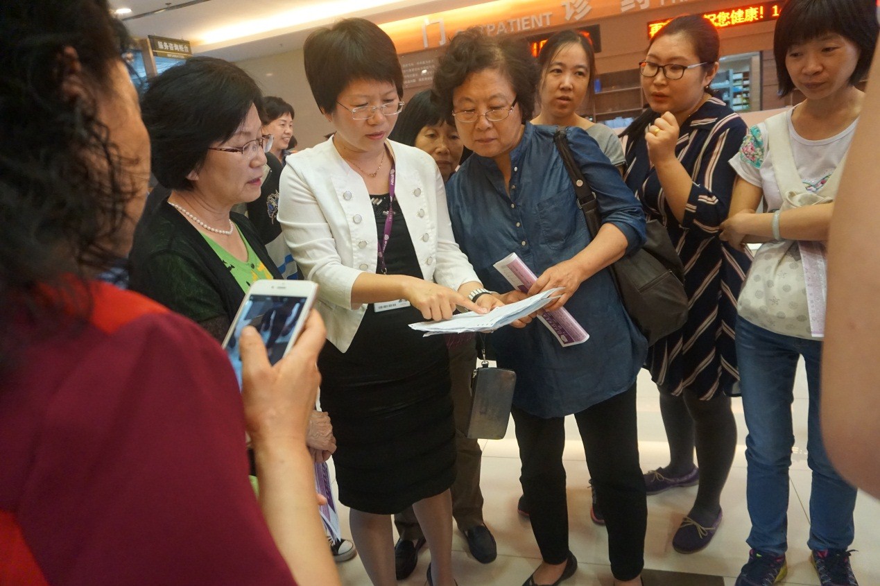 贾明艳会长一行首先来到医疗大楼,深入了解了我院挂号柜台、门诊药房、抽血柜台的工作流程、参观了门诊诊间、住院服务中心、儿科、急诊科及病房等地。各位老师对医院处处“以病人为中心”的医疗空间设置及患者诊疗动线、就诊环境、医疗服务理念表示称赞。