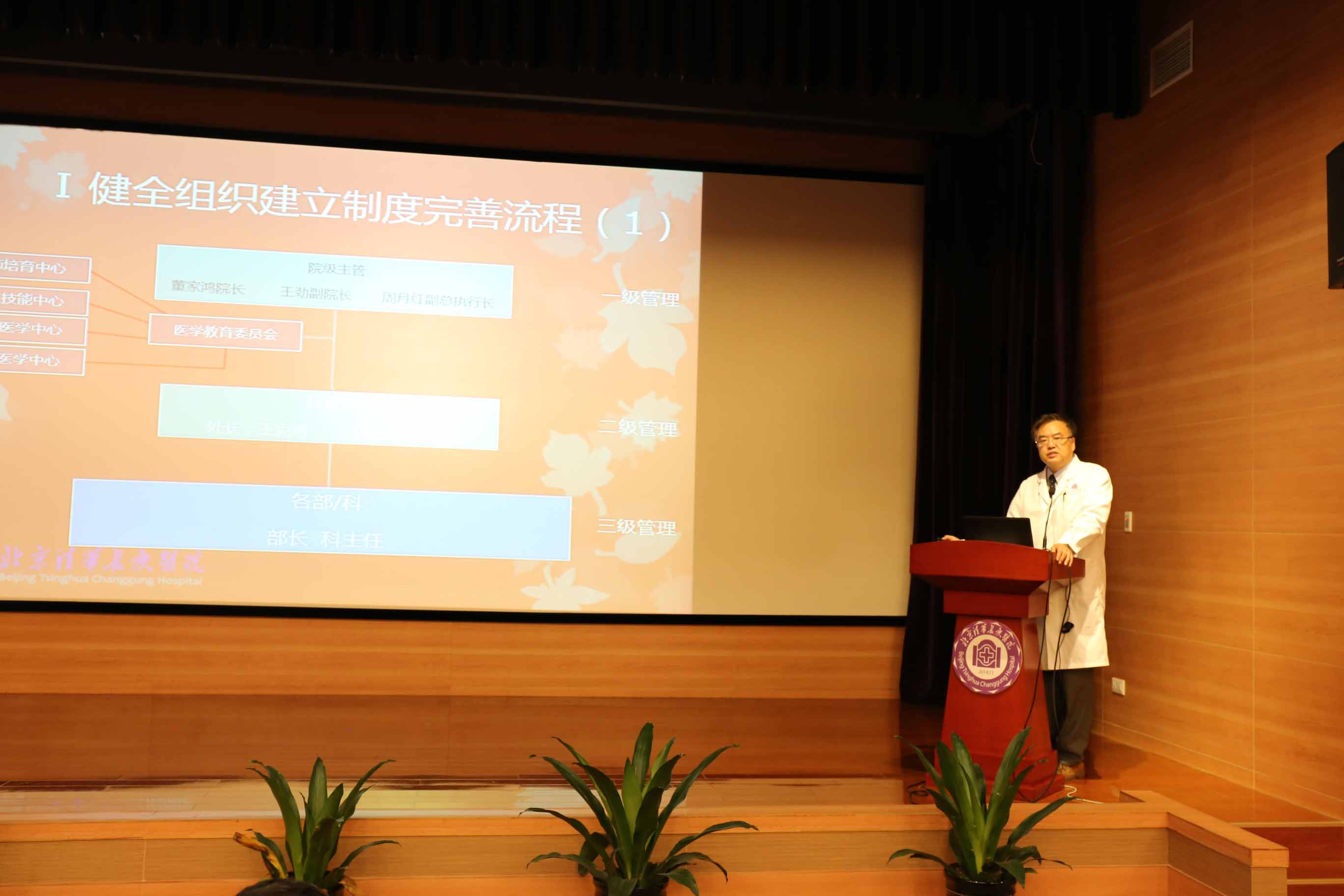 王劲副院长对我院的教育教学工作进行了简短的汇报。我院开业运营进入第十个月,但是我院的教育教学工作的开展远远早于开业的时间,在医院筹备阶段就将人才培养纳入医院的重要战略部署,特别是在过去的一年里,医院在全体教师和住院医师的共同努力下,健全组织、建立制度、完善流程,花大力气完成住院专科医师一体化培养方案并付诸实施,不断建设教学环境创造条件,建立完善的继续医学教育管理体系,开展师资培育建设师资队伍,实行教学工作稽核不断改进,取得了巨大的成绩,但也存在很大的改进空间,全院教职员工要再接再厉,共同打造育人平台,奠定医院持续发展的重要基石。