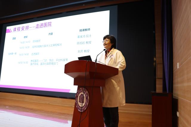 陈旭岩介绍了课程概况,并做“临床医学生人文素养培育”主题报告。她教导同学们“医学是科学、更是人学;医生是对待生命体验的总和;医生是职业人,更是集成了先辈光荣遗风的人”;课程将通过“价值塑造、能力培养、知识传授”由点到面进行三位一体培养,加强同学们人文素养培育,帮助并鼓励学生们成为“规范化、科学化、专业化、职业化”的临床医学生;同时注重为“健康中国”战略,全面培养医学人才,提高岗位胜任力。