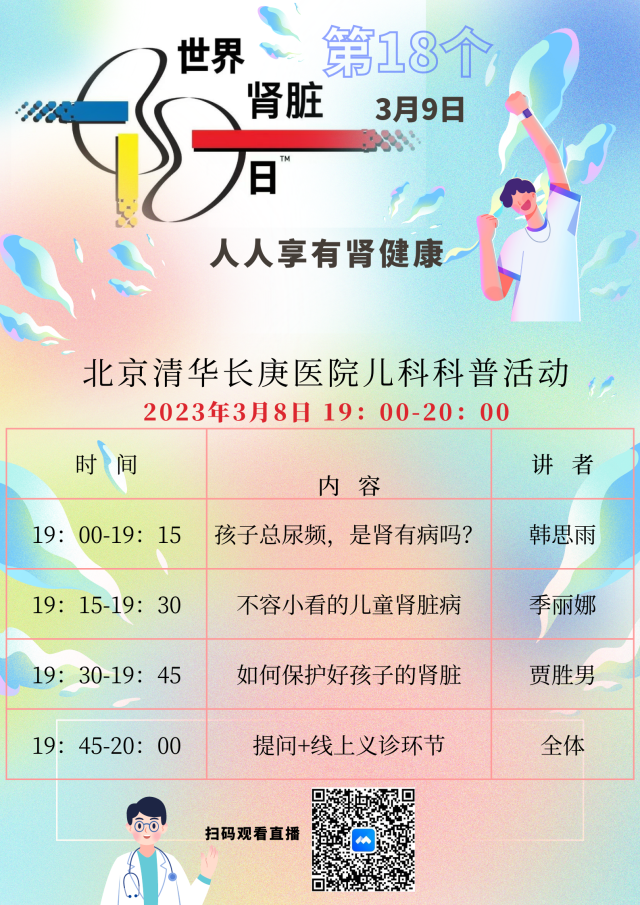 2023年3月9日是第18个“世界肾脏日”,今年的世界肾脏日主题为“全民肾康——未雨绸缪,关注肾病风险人群”,北京清华长庚医院儿科将举办线上科普讲座+义诊活动。