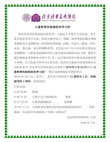 活动预告:北京清华长庚医院儿科举办“儿童春季传染病防治学习班”