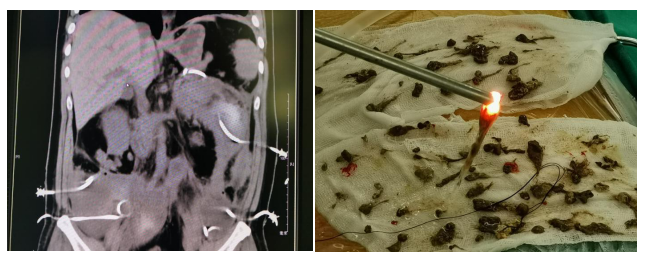 (左)广泛的腹膜后坏死合并感染 (右)肾镜清除出来的坏死组织