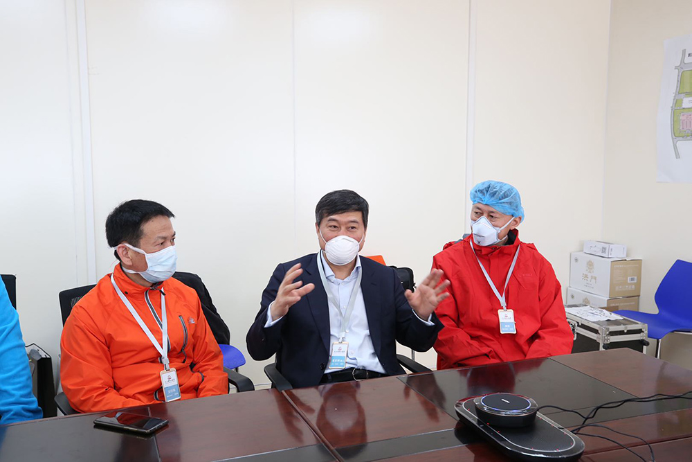 2月25日,中国工程院院士、著名胆外科专家董家鸿教授(中)来到武汉雷神山医院进行新冠肺炎危重症患者5G会诊。武汉大学中南医院 图