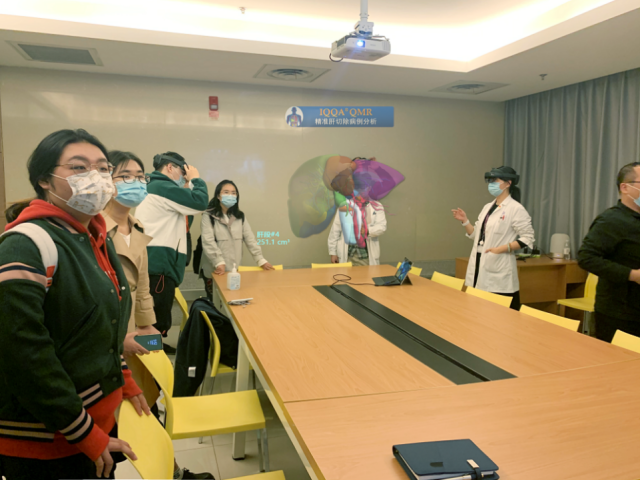 肝胆胰外科执行主任卢倩展示了医院既有的三维重建系统,即在电脑上展现基于患者增强CT扫描图片制作的虚拟三维图形,并借助混合现实技术,进一步将虚拟三维图形导入智能眼镜和头戴显示设备,同学们通过智能眼镜,能够同时观看到真实世界图像和虚拟图像,对投射的虚拟肝脏三维影像进行移动、旋转、放大、切割等操作,获得肝脏体积等可量化数据。