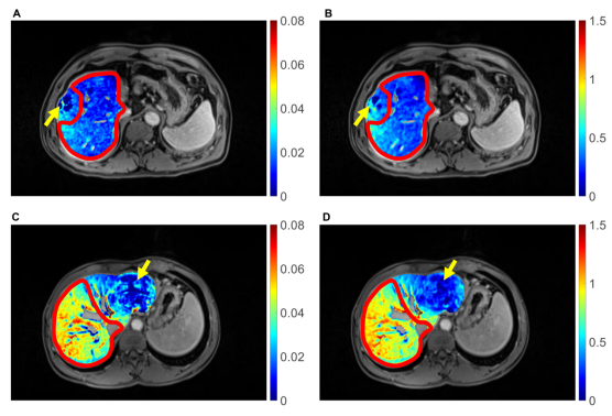 针对上述问题,北京清华长庚医院与清华大学生物医学影像研究中心、陆军军医大学附属西南医院合作收集了116例接受肝切除手术的肝细胞癌患者的数据。基于患者肝切除手术前的动态Gd-EOB-DTPA增强磁共振图像,以肝脏功能参数(Gd-EOB-DTPA肝细胞内吸收速率UR,肝实质15分钟相对增强RE15)为核心,结合剩余肝脏体积,创新性的提出了剩余肝脏功能参数RFUR (ml/min)和RFRE15(ml),分别定义为剩余肝脏区域内各像素点的肝脏功能参数(UR,RE15)的总和,用于区分术后肝衰和非肝衰患者并预测术后肝衰。