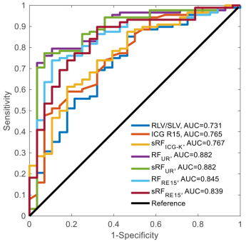 统计分析结果表明,本研究中提出的剩余肝脏功能参数RFUR (ml/min)和RFRE15(ml)在肝衰和非肝衰患者组之间具有显著性差异;在预测术后肝衰方面,RFUR (ml/min)和RFRE15(ml)具有更大的曲线下面积(AUC),分别达到了0.882和0.845,均优于传统的基于RLV/SLV或ICG的肝脏功能评估方法(图2,RLV/SLV:0.731,ICG R15:0.765,RFICG-K:0.767);多变量逻辑回归的结果表示RFUR (ml/min)和RFRE15(ml)是术后肝衰的独立预测因子。本研究验证了肝切除术前,使用肝胆特异性造影剂Gd-EOB-DTPA增强磁共振扫描序列,量化评估肝癌患者剩余部分肝脏功能的可行性,以及其预测术后肝衰的能力,提出的量化技术明显优于临床现有方法,使肝切除术前精确评估剩余肝脏功能体积成为可能,可与现有影像后处理平台整合,具有重要的临床应用价值,有望明显改善目前肝脏部分切除术后肝衰竭的发病率和死亡率。