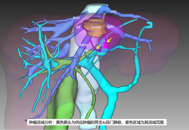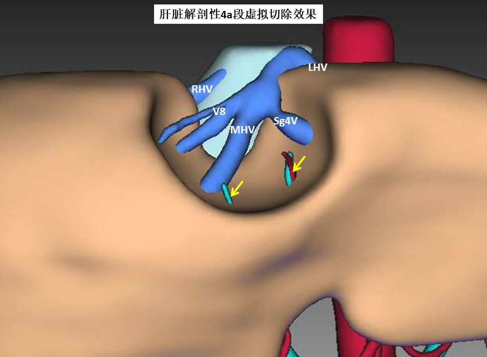 肝脏肿瘤位于肝中静脉主干(MHV)、肝脏8段肝静脉(V8)和肝脏4段肝静脉(Sg4V)三支肝静脉分叉处的腹侧,肝癌由肝脏4a段门静脉分支供血,4b段门静脉未参与肿瘤供血