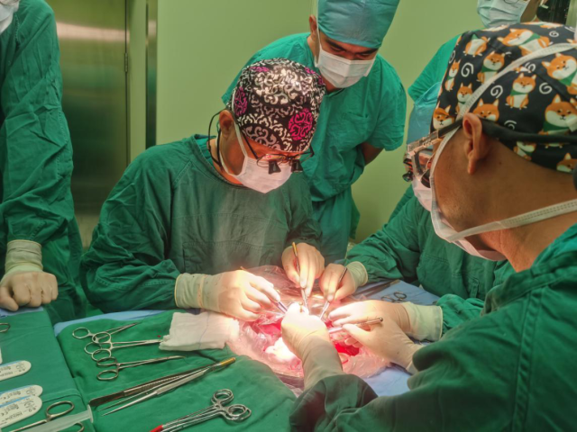 手术来到了最关键的一步——移植血管重建。董家鸿主刀,李元新、汤睿配合,利用异体血管取代肠系膜上静脉主干,并与3根尚未被肿瘤侵袭的静脉属分支进行吻合,最粗的血管属支直径也未超过5毫米,董家鸿以其开创的精准外科技艺完成血管成形、重建,这段宝贵的血管就是小肠血液输送的主干道,“修整”好的自体小肠仍有3.1米,远远高于满足人体正常生活的1.5米要求,重新移植回梓婷的体内。手术历时13个小时顺利结束,术中出血量仅300毫升。