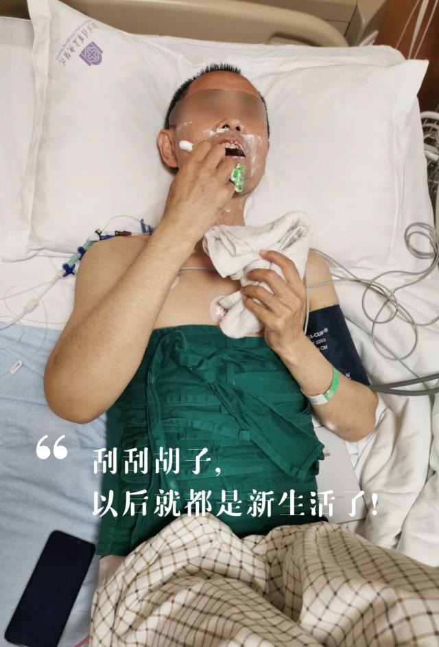 医生护士清晨查房时,术后恢复良好的赵哥(化名)正在忙活着给自己刮胡子,他因肝硬化已严重到失代偿期进行了肝脏移植手术。看见肝胆胰中心熟悉的医护还开心地招呼道,“病床上也不能邋遢,我得倍儿精神地迎接以后的新生活啊!(拍摄 护理部 郝华媛)