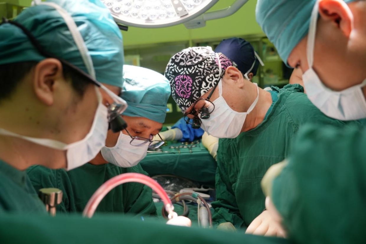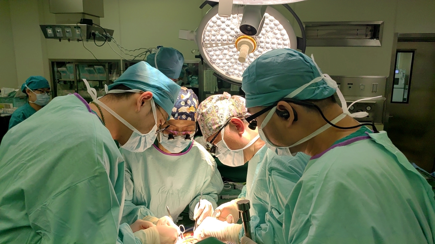 图为董家鸿(右2)带领团队为青海转诊包虫病患者手术(杨欣/摄)
