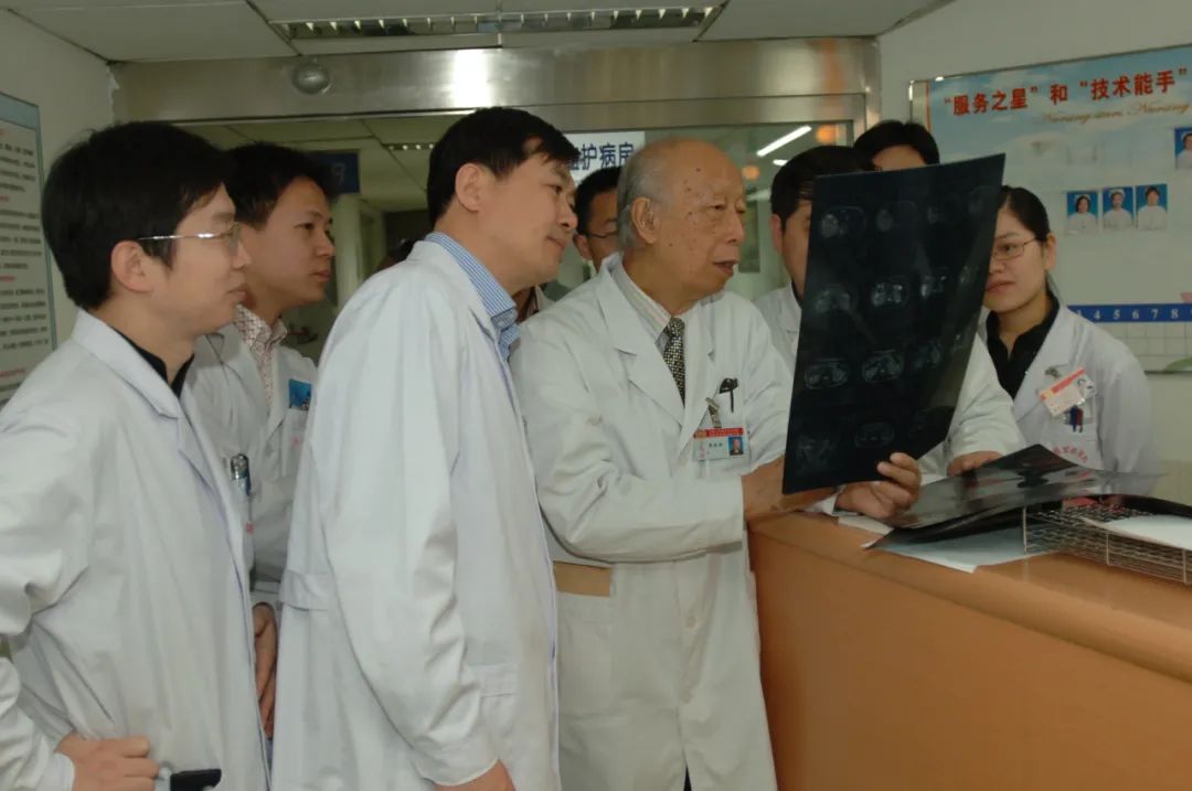 黄志强院士(中)和学生们一起进行病例讨论,左三为董家鸿院士