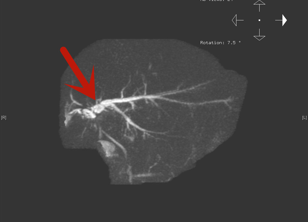 磁共振影像可见胆管堵塞位置(红色箭头处)较高