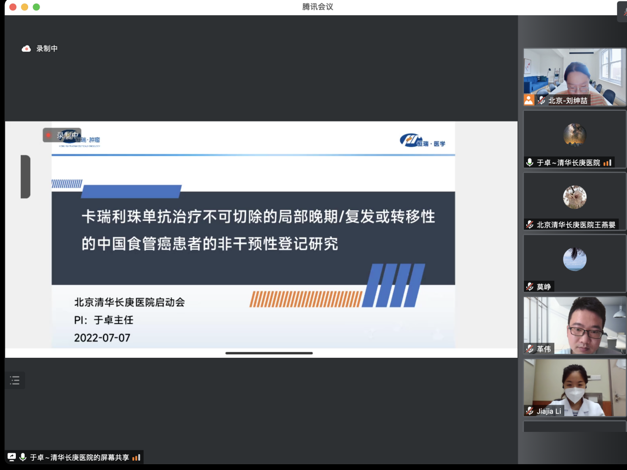 北京清华长庚医院7月11日电(通讯员 温晓夕)7月7日,我院血液肿瘤科、肝胆胰外科、信息管理部及江苏恒瑞医药股份有限公司代表,以线上形式共同召开卡瑞利珠单抗治疗不可切除的局部晚期/复发或转移性的中国食管癌患者的非干预性登记研究启动会暨研讨会。项目负责人于卓,数智医学平台建设团队冯晓彬、黎成权、俞小毛、周佳雯、杨羿、温晓夕及血液肿瘤科莫峥、汪变红、毛雪涵、王燕婴、赵亚静等出席了本次会议。