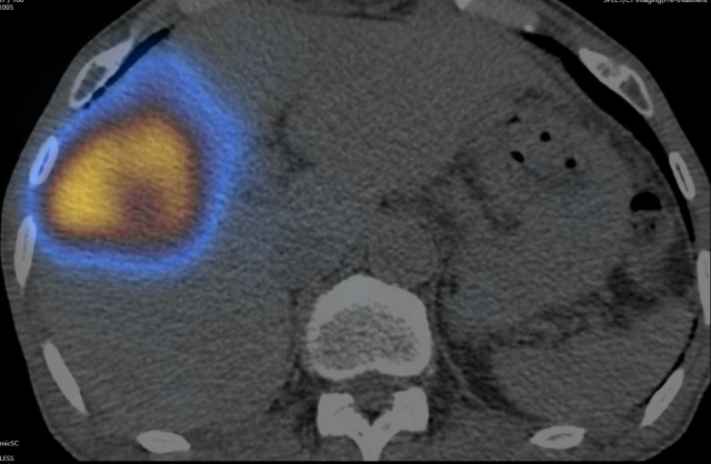 由由疾控感控办公室协助,全面做好接诊空间、疫情防控和消杀部署,核医学科、放射科、钇90中心导管室、留观室、肝胆胰中心医护团队严密防护,经约4小时,患者钇[90Y]微球介入治疗手术顺利完成。术后SPECT/CT显示病灶部位微球浓聚良好,无肝外微球异常浓聚,患者肝功正常,术后第二日顺利出院。(编辑 韩冬野)