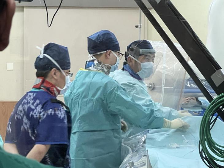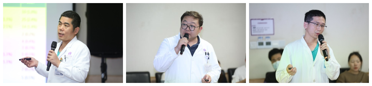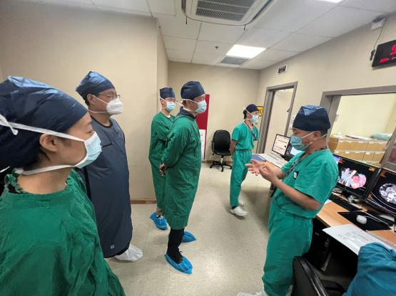 钇90专病中心督导教师张琳(左)、黄鑫(右)、核医学科梁子威(中)现场授课理论讲解