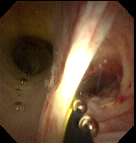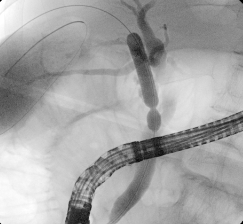 我院李虎城主任医师接诊阅片后,综合评估老人的病情,最终决定为老人行内镜下胆囊胆管取石术+胆囊引流管置入术,术中见胆总管扩张,胆囊及肝内胆管正常显影,见胆总管粘膜基本正常,可见多发小碎石,沿导丝经胆囊管进入胆囊,胆囊内见大量泥沙样小颗粒结石、胆汁黏稠,胆囊壁未见明确新生物,大量生理盐水冲洗胆囊,见墨绿色泥沙样胆汁流出。退出胆道子镜,取石球囊取出胆总管内结石。手术过程顺利,术中生命体征平稳,术后安返病房。术中字母镜图像如下