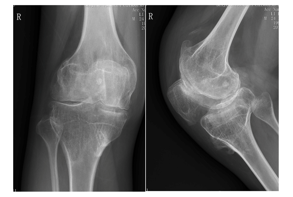 右膝关节X线片,骨质破坏严重