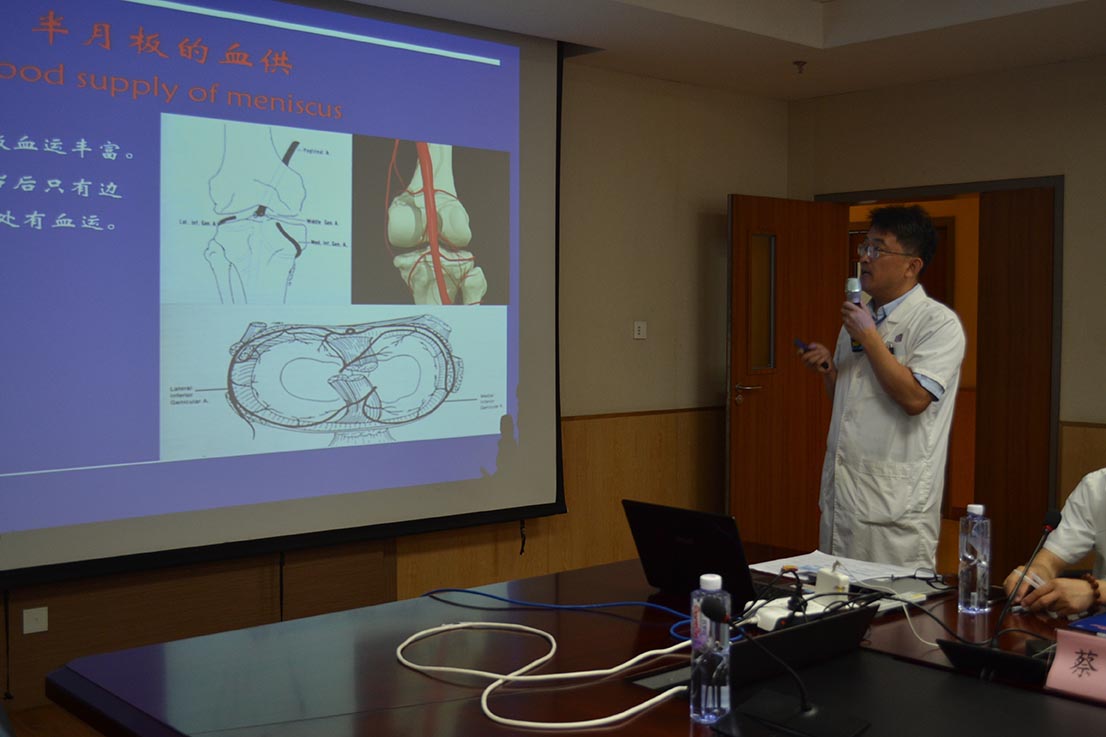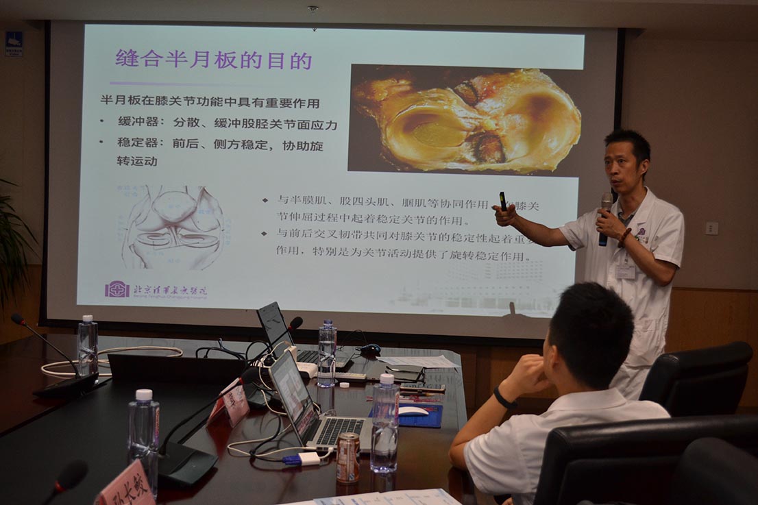 本次精品课程严格控制学员人数,采用圆桌会议讨论的形式,所有学员高度参与,为大家提供了精品高效的课程,在培训课堂上,我院骨科关节中心各位专家及医生轮流授课:关节中心主任蔡谞教授介绍了半月板缝合的指证和手术技巧,对内侧副韧带,前交叉韧带损伤及后交叉韧带损伤后的重建技巧进行了生动演讲,并进行了单束前交叉韧带的手术演示,陈连旭主任介绍了半月板损伤的治疗,内外侧复合体的诊断与修复,对前交叉韧带重建过去、创新、争论方面进行了精彩的阐述,并进行了双束前交叉韧带重建的手术演示。孙长鲛博士通过大量的MRI图片,讲解了半月板撕裂的MRI诊断,结合平常临床工作中可能遇到的误诊情况进行了生动的阐述,同时与何大炜博士共同主持了病例讨论,大家畅所欲言,台上台下互动即时解疑答惑。付立功博士详细讲解了前交叉韧带损伤的诊断及术后的评估并进行了膝关节半月板部分切除术的手术演示。