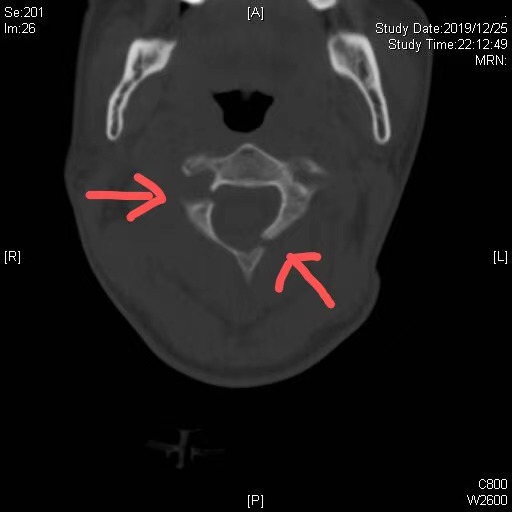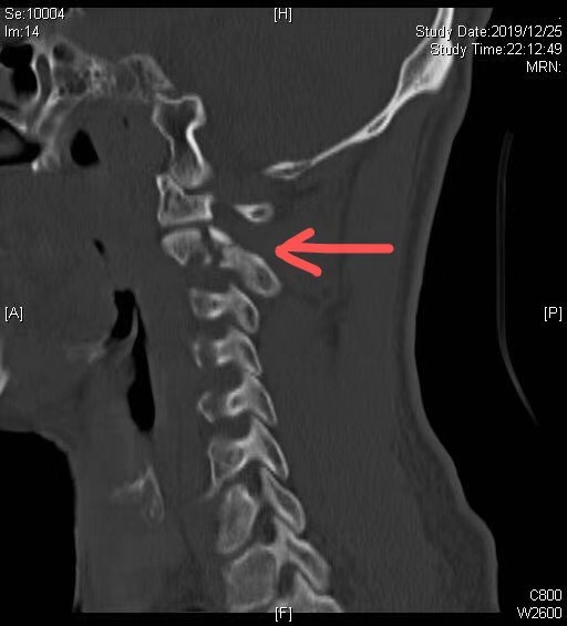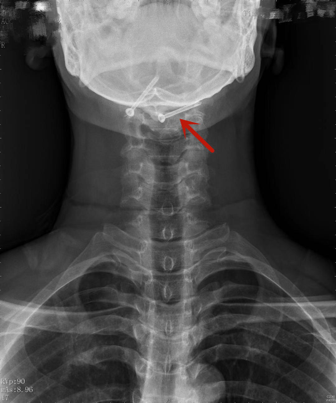 患者刚过知天命之年,车祸导致其第二颈椎(枢椎)多发骨折,骨科肖嵩华主任医师评估患者情况后,认为该骨折累及枢椎的椎弓根、椎板及附件,属于不稳定性骨折,具备内固定的手术指征,然而该患者损伤部位较高,紧邻生命中枢,且骨折块细小,对螺钉置入的精度要求极高(误差容错小于1mm),手术难度较大。“如果采用传统的手术方式,手术需要从颈后部位开大口子,创伤较大,对患者的恢复不利。”胡冬医师说道。为使患者能够更快康复,肖嵩华决定使用天玑机器人为患者进行手术。