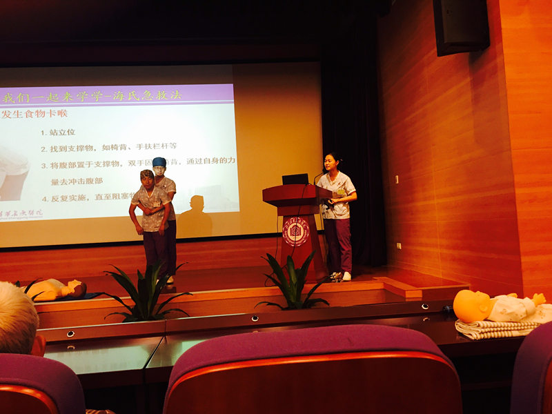 清华长庚9月25日电(通讯员 王非 刘忠涛)为增强广大民众的自救互救意识,提高自救施救能力,2015年9月19日上午我院急诊科与志愿者工作部在集会厅举办了以“抢救在身边”为主题的急救知识培训讲座。培训会上我院急诊科徐婷医师和王丹丹护士长生动详细地讲解了生活中突发情况的基本急救知识,帮助现场观众掌握科学的急救方法并提供专业的技术指导。