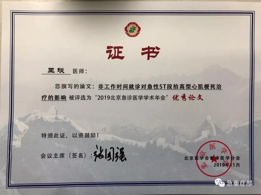 王琰住院总医师所著论文《非工作时间就诊对急性ST段抬高型心肌梗死的治疗的影响》,研究课题立足临床,设计严谨,讨论充分,获评大会优秀论文。