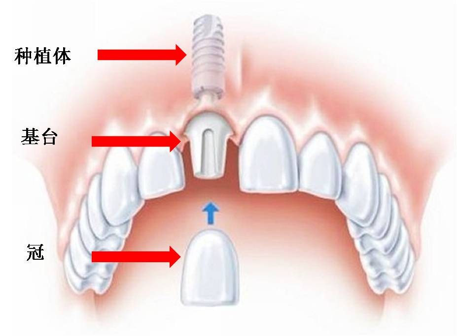 (一)种植义齿的基本组成结构:1.、种植体:是植入骨内的部分,目前流行的仍是预制件,不同厂家制作的种植体在形态、长度、直径、表面处理等不尽相同;2、基台:是种植体穿过软组织的部分,通常用螺丝将它固定在种植体上;3.、上部结构:指修复体通常所具有的冠、桥、支架、附着体等结构。与常规义齿相比,种植义齿可通过标准预制的构件更方便、更精确地通过基台将修复体与种植体相连接。