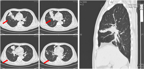图1入院胸部CT可见右肺中叶和右肺下叶内基底段可见多发斑片和片状肺内渗出实变影(箭头所示)