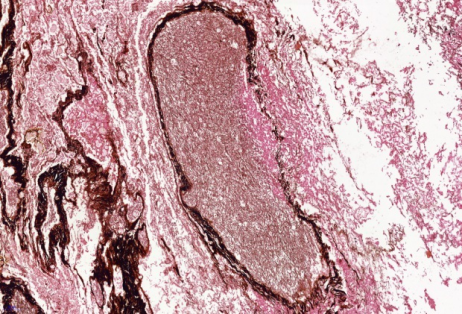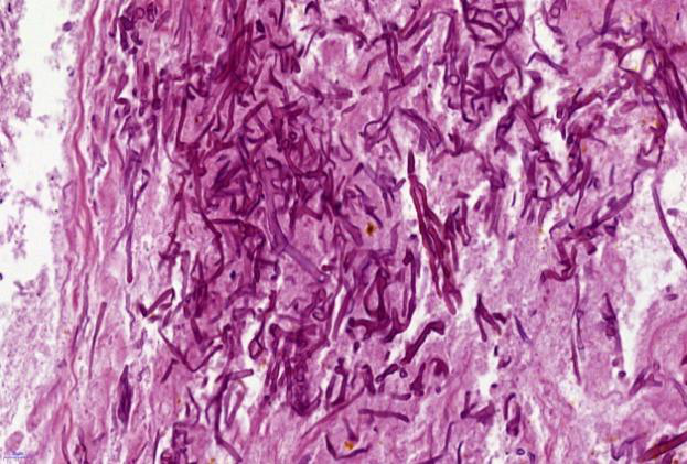 图2病理显示坏死组织内大量毛霉菌菌丝,并可见菌丝侵袭血管(GMS染色及弹力纤维染色)