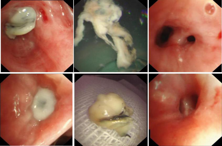 图3应用冷冻等支气管镜介入技术取出脓栓,并应用两性霉素B进行局部灌注治疗