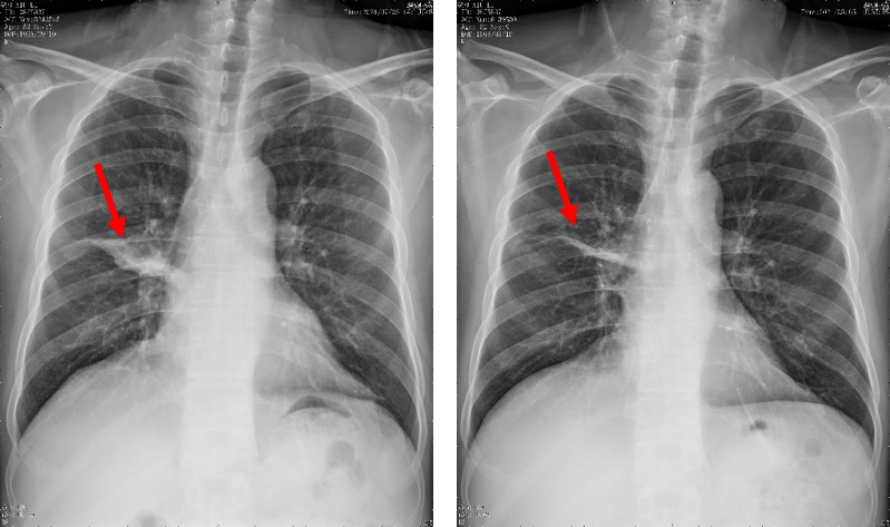 图4入院时胸片显示右肺病变;治疗1个月后复查胸片显示右肺病变明显吸收好转